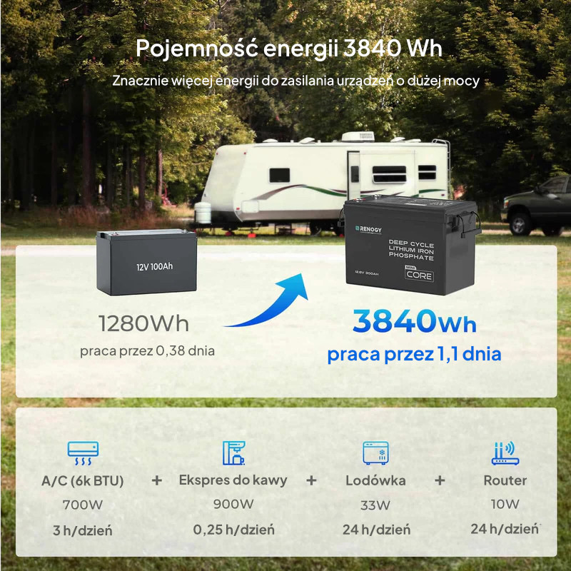 Renogy Core Mini 12,8V 300Ah to kompaktowy akumulator LiFePO₄ do kamperów, małych przyczep, łodzi i zastosowań off-grid, zaprojektowany z myślą o dużej pojemności w mobilnej, odpornej konstrukcji. Ma odcięcie ładowania przy niskiej temperaturze, dzięki czemu bezpieczniej pracuje zimą, pozwala na montaż na boku w ciasnych przestrzeniach, a obudowa IP65 i podwyższona odporność na wibracje sprawiają, że dobrze znosi jazdę terenową i warunki morskie. Pryzmatyczne ogniwa klasy EV (UL) zapewniają długą żywotność (ok. 5000 cykli przy 80% DoD) oraz wysoką moc chwilową dla odbiorników z dużym prądem rozruchowym. Po sparowaniu z Renogy 300A Shunt możliwy jest zdalny monitoring parametrów.